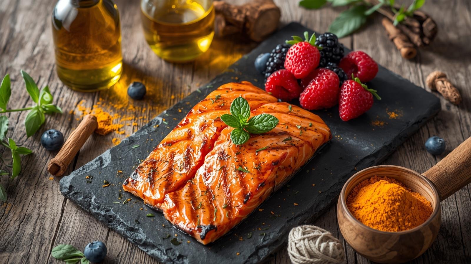 - Vegetais verdes-escuros (espinafre, couve, brócolis) → ricos em vitaminas e minerais que regulam processos inflamatórios.