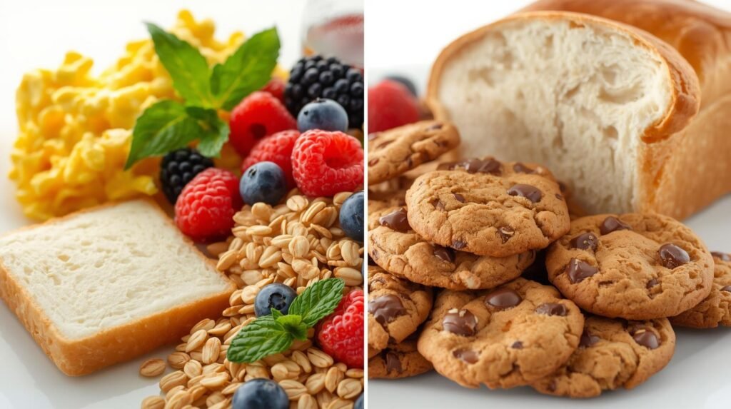 👉 Evite carboidratos refinados como pão francês, bolos, biscoitos e cereais açucarados.